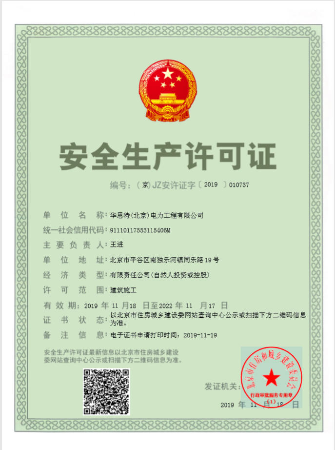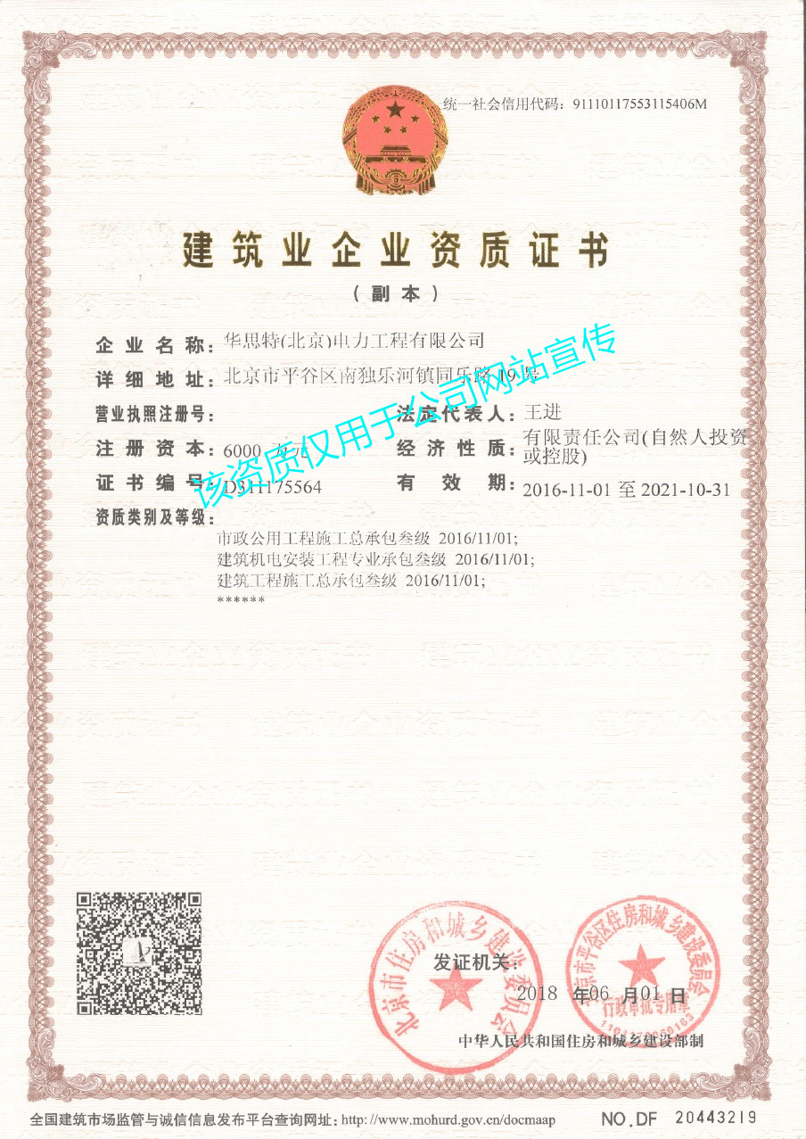 华思特(北京)电力工程有限公司注册资金6000万,是一家集电力施工工程总承包、机电设备安装工程施工专包与维修工程、市政公用工程施工专包、送变电工程、城市及道路照明工程和售后服务于一体的建筑配套性企业。